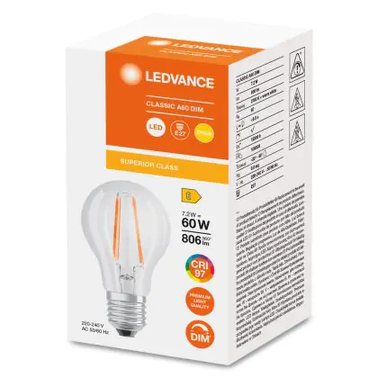 Ledvance Classic LED E27 Birne Fadenlampe Klar 7.2W 806lm - 927 | Höchste Farbwiedergabe - Dimmbar - Ersatz für 60W