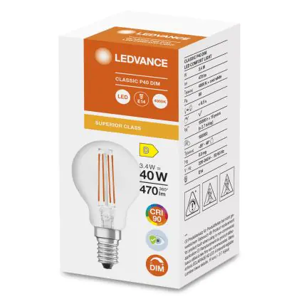 Ledvance Superior Classic LED E14 Kugel Fadenlampe Klar 3.4W 470lm - 940 | Dimmbar - Höchste Farbwiedergabe