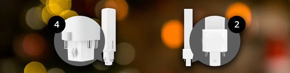 Bei (LED-)Energiesparlampen gibt es Lampensockel mit 2 Stiften oder 4 Stiften. Wählen Sie beim Wechsel zu LED immer eine Energiesparlampe mit dem gleichen Sockel wie zuvor, sonst passt sie nicht in die Leuchte und funktioniert nicht. Energiesparlampen mit einem 2-Stift-Sockel funktionieren mit einem konventionellen Vorschaltgerät (EM) inklusive Starter. Energiesparlampen mit 4-Stift-Sockel funktionieren mit einem elektronischen Vorschaltgerät (HF) ohne Starter.