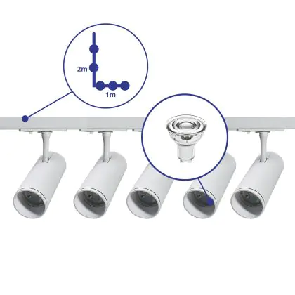Description Ensemble complet Rail Monophasé Rail L 1 x 2 Mètre Blanc | incl. 5x Spot + GU10 2700K 3W Dimmable + Embout, Connecteur d’Alimentation et L -Connecteur