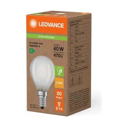 Cette ampoule Ledvance LED Classic E14 Poire Filament Dépolie 2.2W 470lm - 827 | Remplacement 40W avec son efficacité lumineuse de lumen par watt vous permettra de profiter d’un éclairage de qualité. Avec sa durée de vie de 50000 heures, vous n’aurez pas à vous soucier de son remplacement avant quelques années.