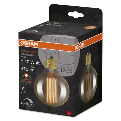 Description Osram Vintage 1906 LED E27 Globe Filament Gold 80mm 5.8W 470lm - 822 Extra Warm White | Dimmable