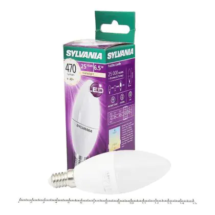 Cette ampoule Sylvania ToLEDo E14 Bougie Dépolie 5.5W 470lm - 827 | Remplacement 40W avec son efficacité lumineuse de lumen par watt vous permettra de profiter d’un éclairage de qualité. Avec sa durée de vie de 25000 heures, vous n’aurez pas à vous soucier de son remplacement avant quelques années.